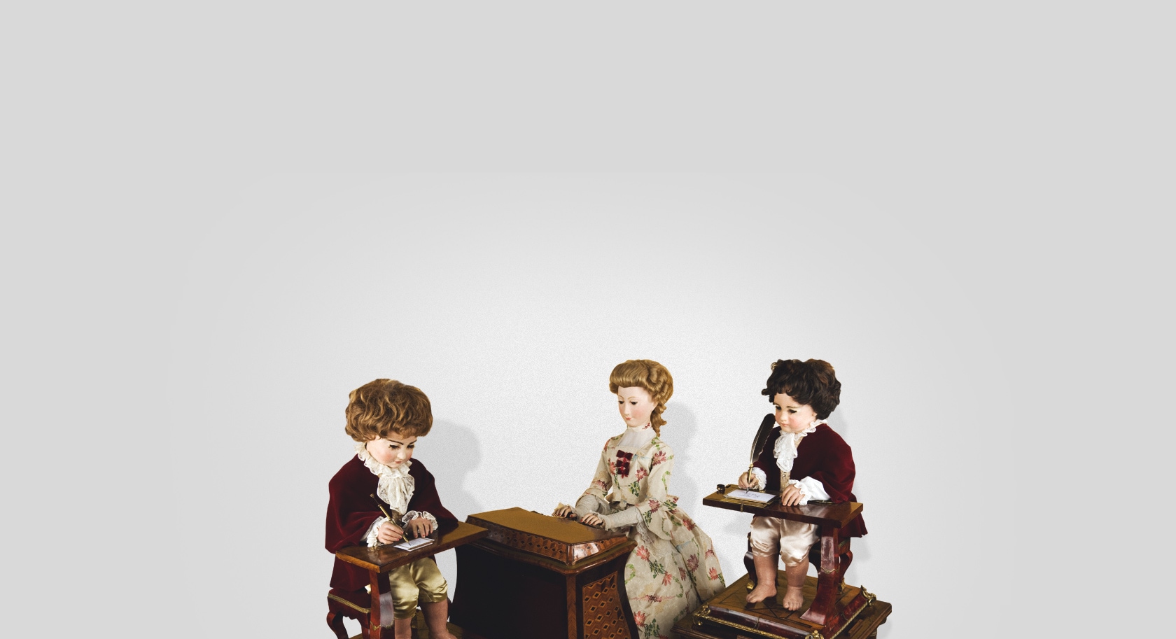 From 1773 onward, Jaquet Droz and Leschot perfected and marketed increasingly sophisticated automata. Their work culminated with the three humanoid automata: The Writer, The Draughtsman and The Musician, presented in La Chaux-de-Fonds in 1774. These three masterpieces, admired by connoisseurs from all over the world, consolidated the reputation of Pierre Jaquet Droz and the success of the business. Encouraged by this success, the Jaquet Drozes took to the road to exhibit these fabulous creations. They took them from La Chaux-de-Fonds to Geneva and then, in 1775, to Paris where they were presented to Louis XVI and his queen, Marie-Antoinette. They were shown in the most prominent courts of Europe, with visits to London, the Low Countries and Flanders in 1780/1781 as well as northern France. They returned to Paris in 1782 and 1783, and exhibited in Lyon in 1784. The automata also travelled to the Russian court in Kazan and to Madrid.Background color