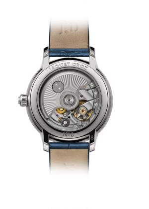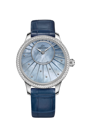 Jaquet Droz 2653, self-winding mechanical movement, double barrel, heavy metal oscillating weight. Blue mother-of-pearl with sunray structure 8 stars appliques with rhodium treatment. 35 mm diameter. Power reserve of 68 hours.
